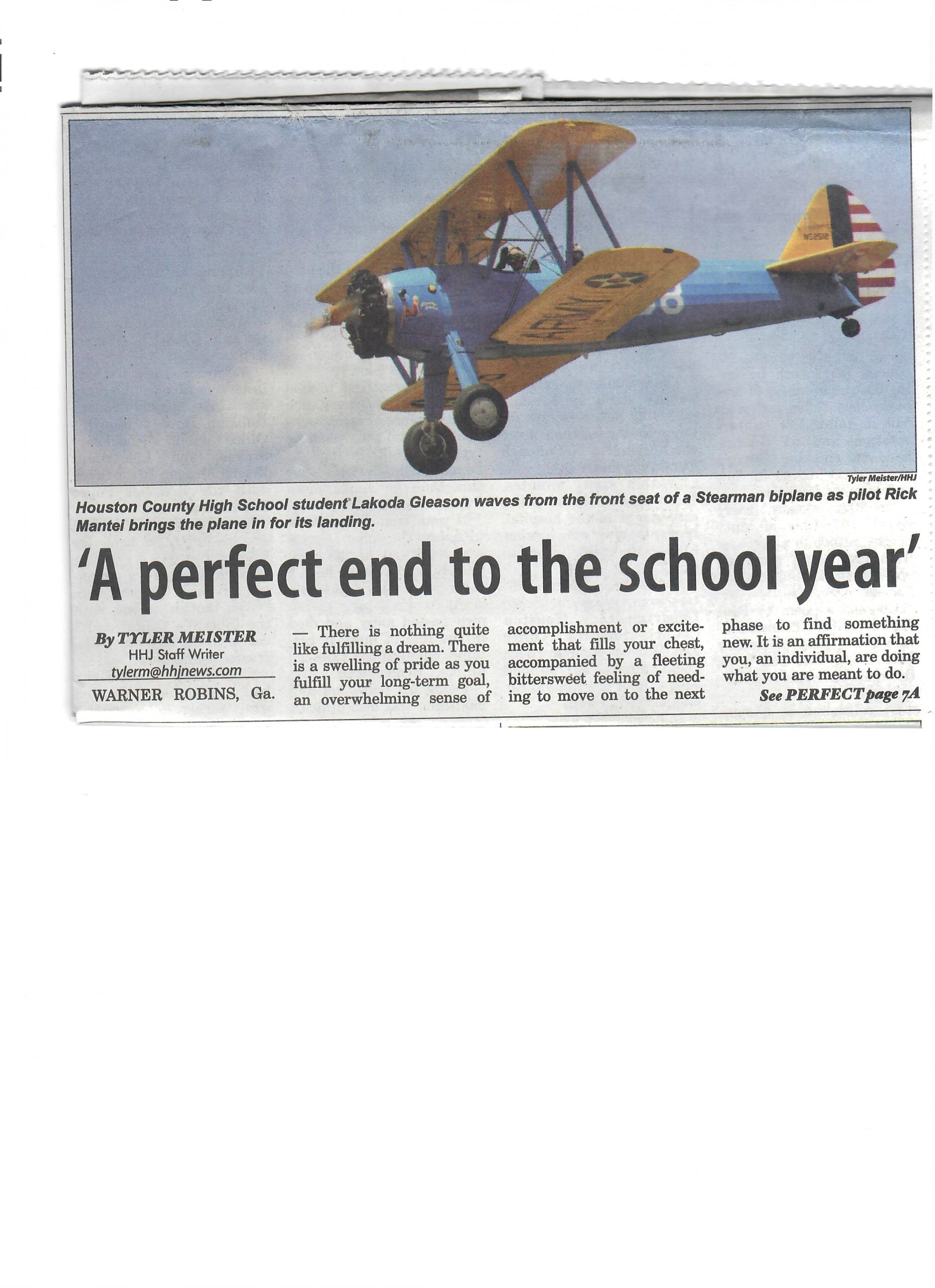 On Friday, May 20, Houston County High School; student Lakoda Gleason experienced some of these feeling as more as he took flight in a PT-17 Stearman — a biplane previously used by the United States Navy and Army Air Forces as primary training plane for upcoming pilots during World War 2 — alongside his pilot, Rick Mantei. He was even able to fly it.