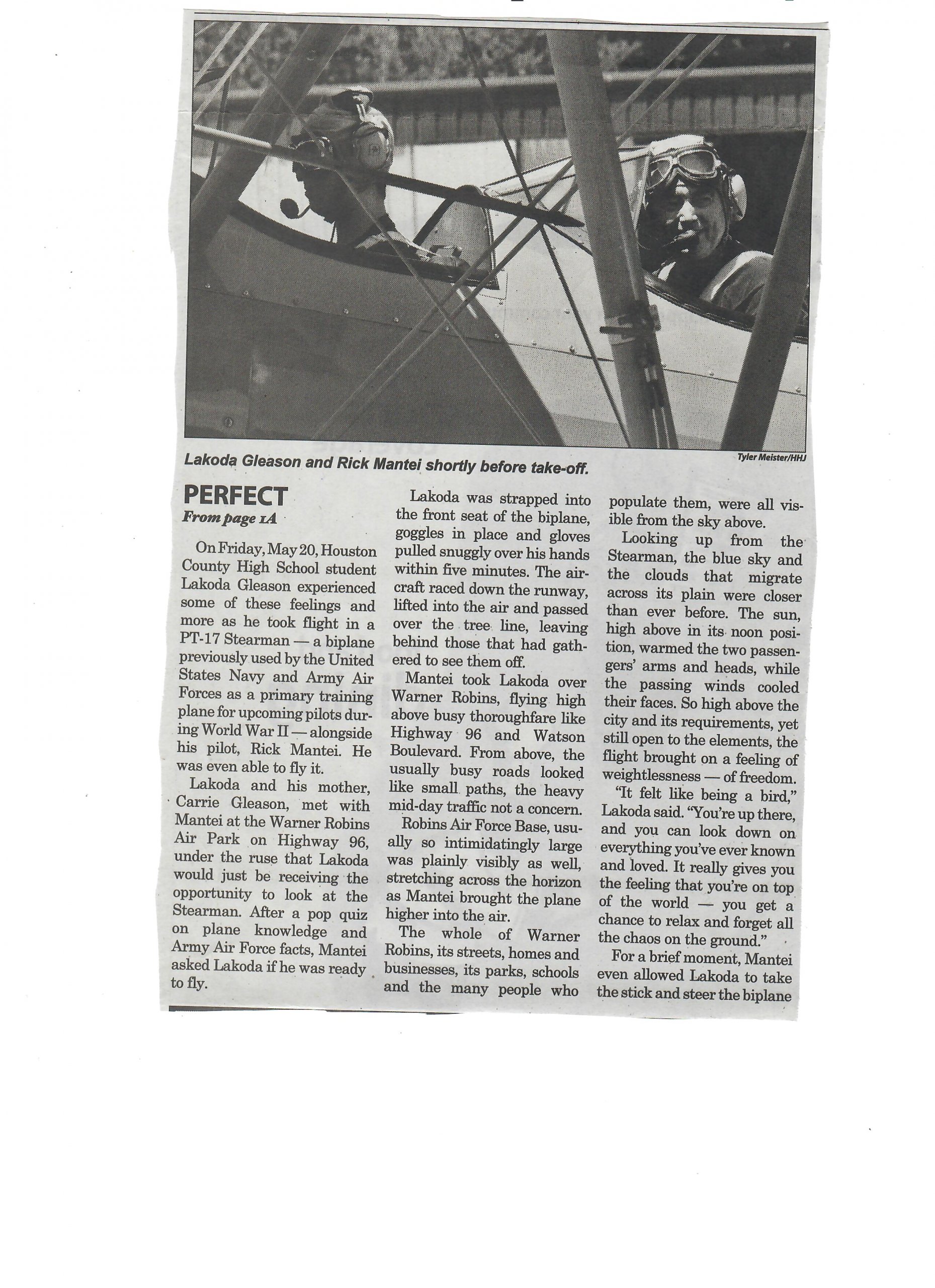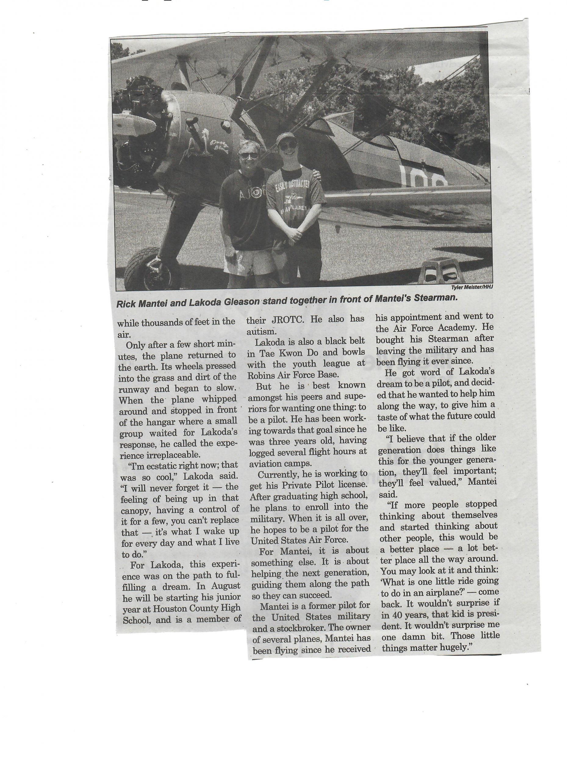 Lakoda and his mother, Carrie Gleason, met with Mantei at the Warner Robins Air Park on Highway 96, under the ruse that Lakoda would just be receiving the opportunity to look at the Stearman. After a pop quiz on plane knowledge and Army Air Force facts, Mantei asked Lakoda if he was ready to fly.