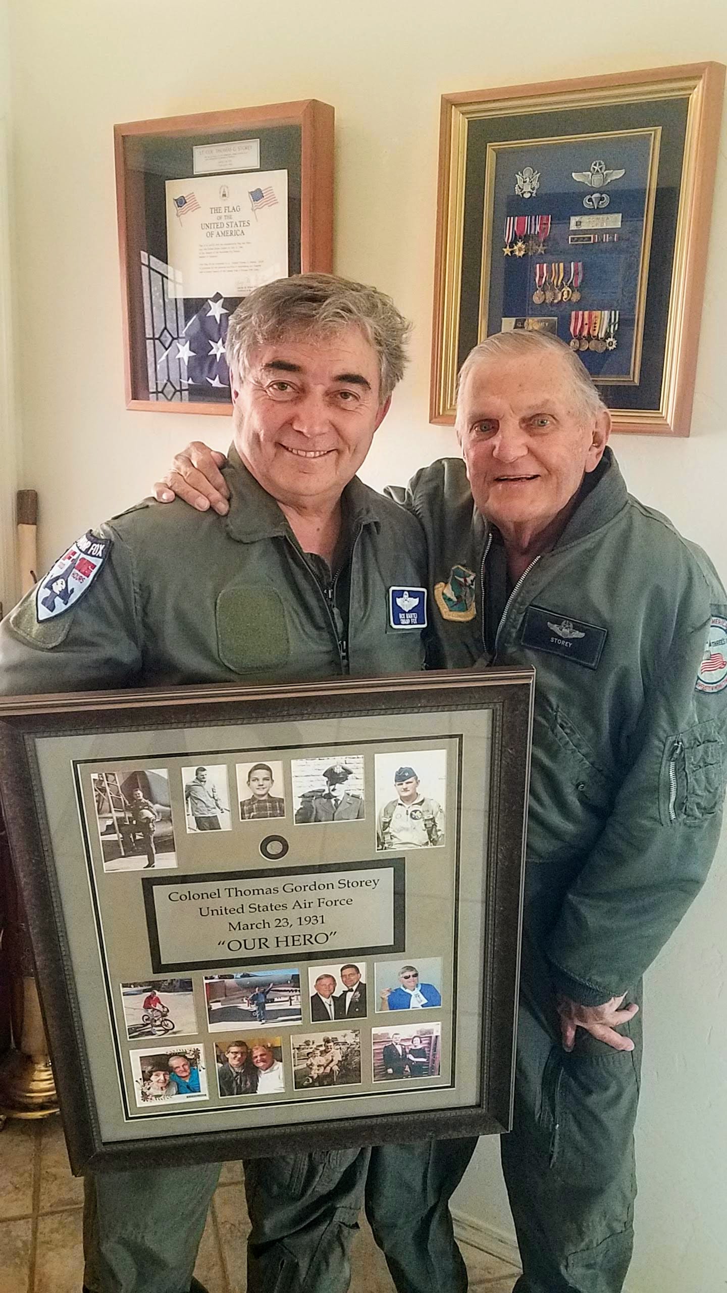 After his return home, Lt. Col. Storey went on to serve as the Director of Operations for the T-41 Mescalero flying program at the U.S. Air Force Academy. There, in 1975, he instructed Rick Mantei in piloting the aircraft, and soloed him in it, as well. When asked who Lt. Col. Storey is to him, Mantei answered, “He’s my hero.” Thus, for Lt. Col. Storey’s 91st birthday, Mantei designed and created a plaque for him featuring photos of his life and career. As an added touch, he included a framed 1931 dime for the year of his birth, as there were no silver dollars minted in that year. Lt. Col. Storey was thrilled by the gift, and the two spent three jovial hours at Storey’s home in Tuscon reminiscing and catching up, 46 years after Mantei’s solo flight with him.