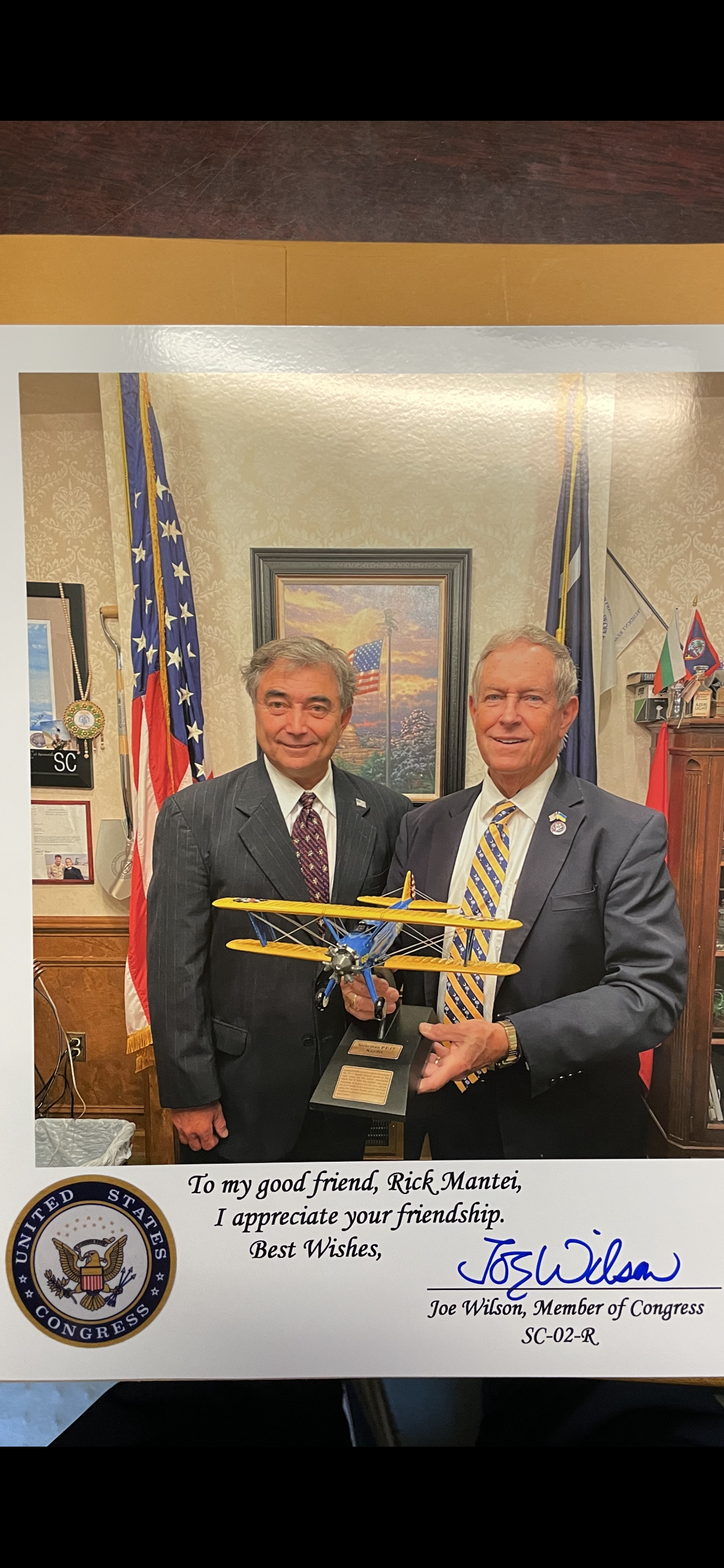 Joe was given a Stearman model to commemorate the milestone event. Rick was invited to Joe’s office on 6/10/2022 as a thank you for the model and the event for General Rew.